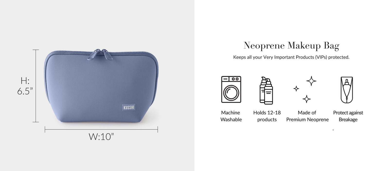 The Neoprene Makeup bag. All products are machine washable and are crafted with a durable exterior made from premium-quality neoprene, offering a protective cushion for all your beauty essentials. These bags will keep all of your Very Important Products (VIPs) protected.