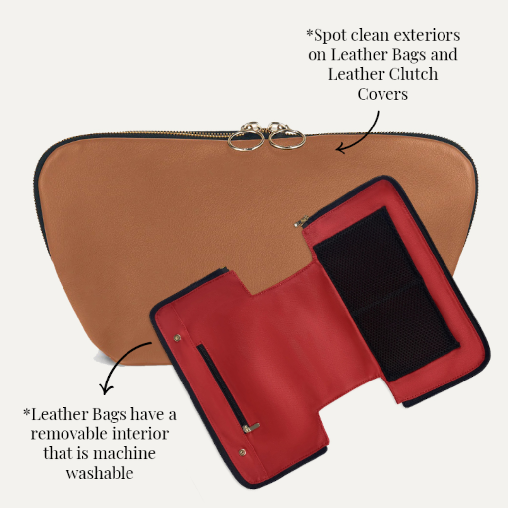Leather exterior is spot clean only with a damp cloth or leather cleaner.