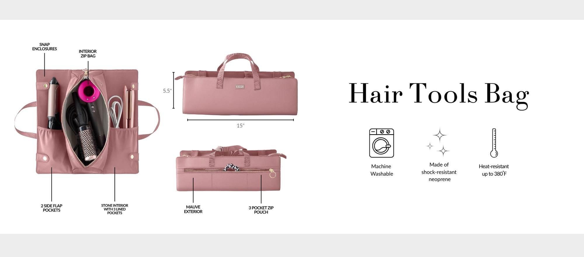 Turn Up the Heat! The Hair Tools Bag is the perfect travel accessory to keep your hot tools protected and organized. Heat-resistant up to 380 degrees F, this is the perfect place to lay your hot tool while it is still warm or once it's cooled. Pockets on each interior flap for brushes, extra hair tools or even hairspray. Use the 3 pocket zipper pouch for small hair accessories like bobby pins, hair ties or clips. With handles to hang anywhere, this is the perfect accessory to use daily or on your next trip. Machine washable and made of 100% premium neoprene.