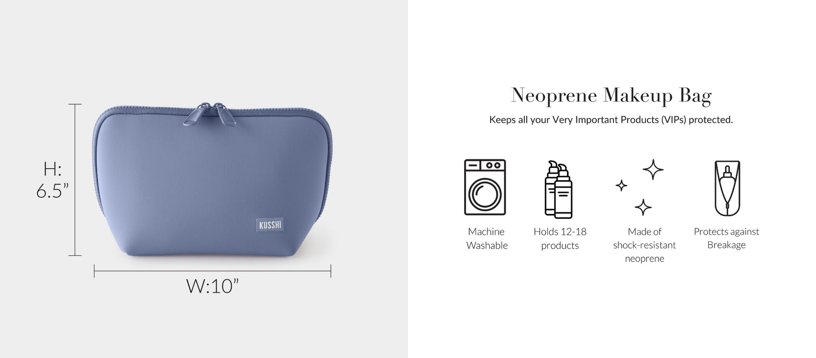The Neoprene Makeup bag. All products are machine washable and are crafted with a durable exterior made from premium-quality neoprene, offering a protective cushion for all your beauty essentials. These bags will keep all of your Very Important Products (VIPs) protected.